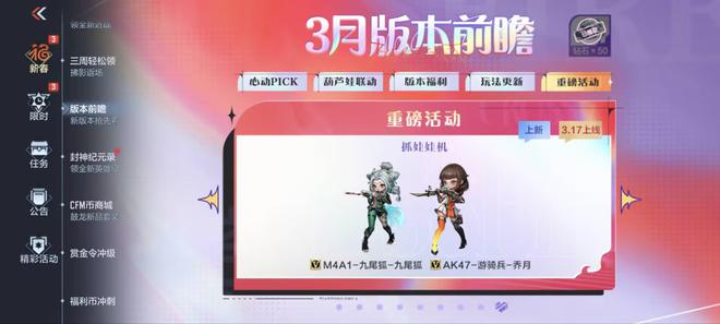 本次奖池中不仅新添加了奖励,还对大奖进行了调整★★◆■■,本次的大奖将乔月,九尾狐◆■◆,孤狼★◆◆■,香香四款角色放置在抓娃娃机角色自选卡当中,将M4A1-九尾狐-九尾狐,M4A1-游骑兵-香香,AK47-游骑兵-乔月三款武器放置在抓娃娃机武器自选卡当中■★★◆◆,这次改动让大奖更具灵活性,避免了重复获取不需要的武器或角色。